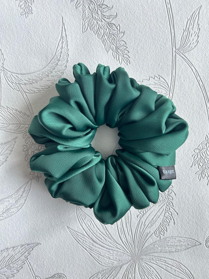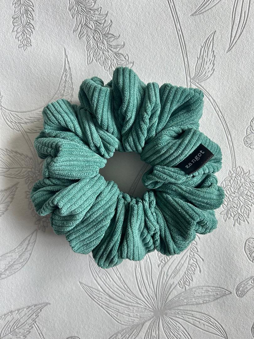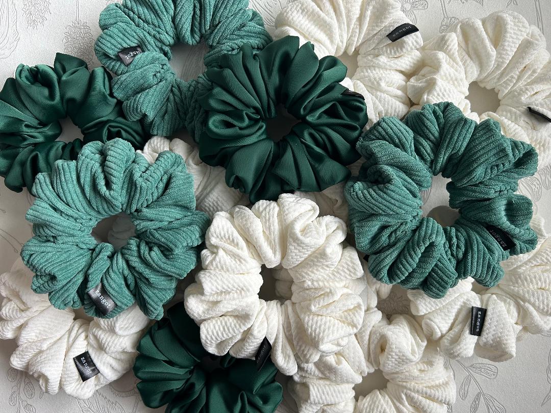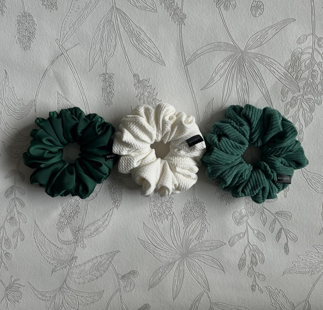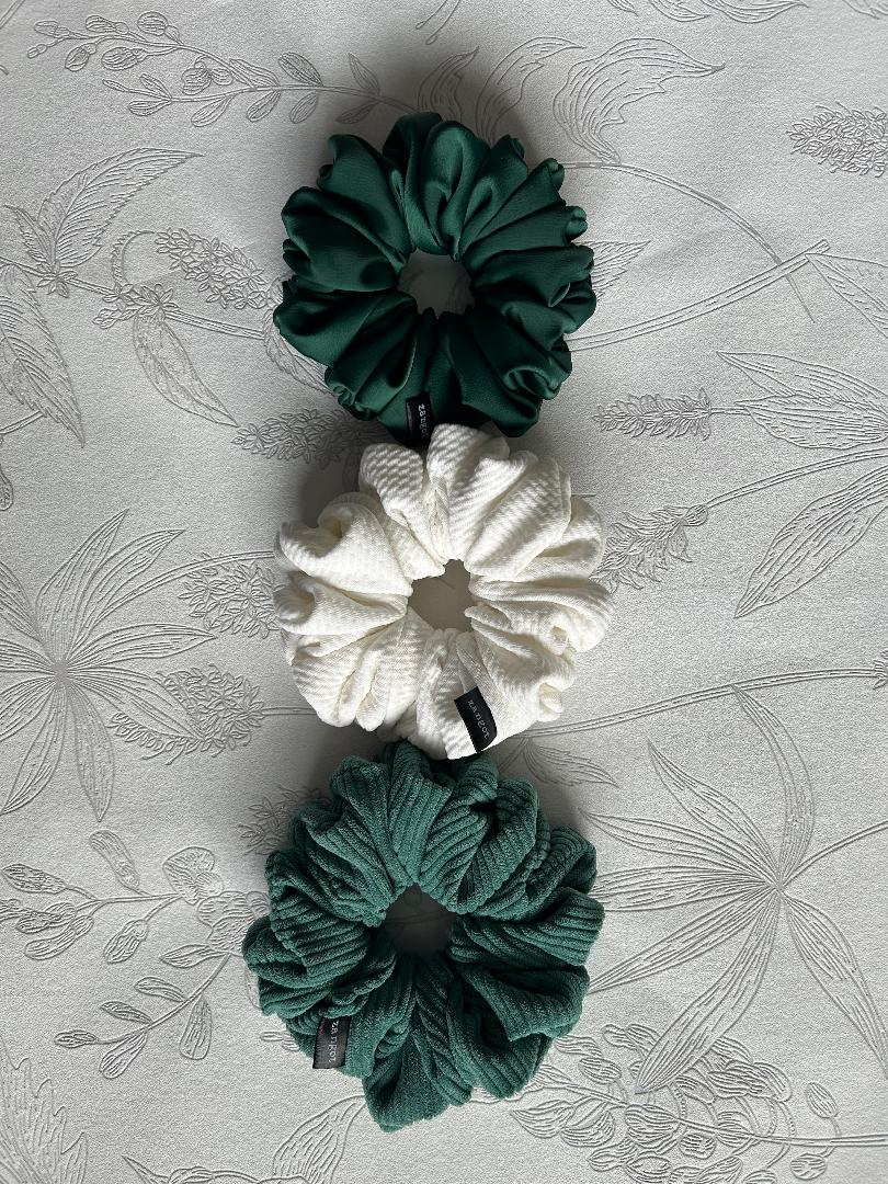 Green Coloured Satin Scrunchie, White Cotton Scrunchie, and Green Corduroy Scrunchie all in medium size. These scrunchies are made of satin fabric, cotton, corduroy and variety of materials including silk, polyester, nylon, cotton, and wool.