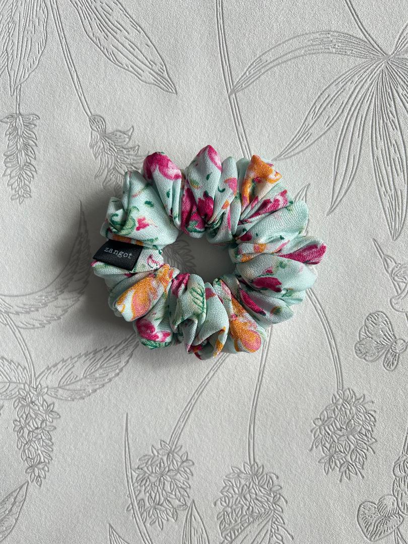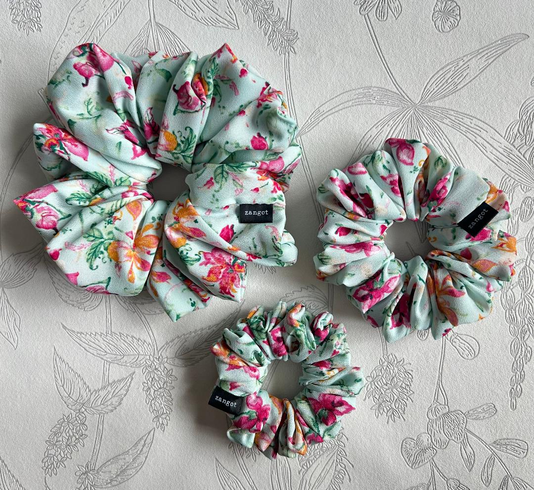 Floral Multicoloured Green/Orange/Pink Scrunchie that is part of our Fall Collection Scrunchies for 2025. This fabric is 100% polyester.