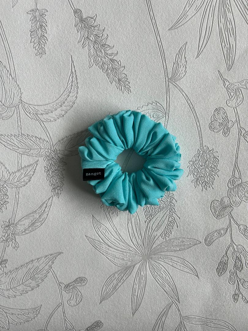 Small Salmon, Aqua, and Amethyst Coloured Scrunchie. This fabric is 100% polyester.